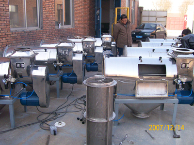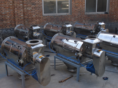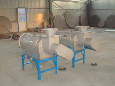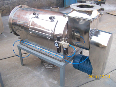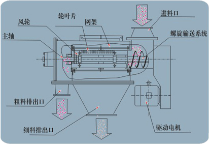 本設備篩網(wǎng)為圓筒狀,置于機體內,物料通過螺旋輸送系統(tǒng)后,和氣流混合、霧化進入網(wǎng)筒內;通過網(wǎng)筒內風輪葉片使物料同時受離心力和旋風推進力,從而迫使物料噴射過網(wǎng),由細料排出口排出,不能過網(wǎng)的物料沿筒壁從粗料排出口排出。